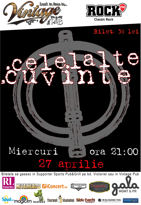 afis celelalte cuvinte micRockerii mei. Frații mei albi și negri, galbeni, roșii și portocalii dacă ați stat prea mult la soare. Prekinii mei virtuali cu care n-apuc să beau o bere. Mă cochii. Cu permisiunea voastră, io evadez pentru câteva zile spre Deva mea natală. Cu cățel și purcel. Daaaar. Daaaaar, înainte să plec, m-am gândit că ar fi frumos să vină iepurașul. Pentru toți nu se poate, dar măcar pentru unul. Miercurea viitoare, drums please, în Vintage Pub cântă Celelalte Cuvinte. Să vă povestesc toată istoria mea cu această trupă, concertele pe care îmi cheltuiam alocația, ar însemna să mai cumpăr găzduire pe server. Rezum în câteva cuvinte. După mine, rockul românesc n-ar fi nimic fără Iris, Compact și Celelalte Cuvinte. Iris și Compact cântă mult mai des și poate nu mai crează starea asta de neliniște, emoțiile astea pe care le am eu acum. Aștept concertul ăsta ca pe nu știu ce. Și îl aștept pe unul din voi alături de mine, cu pleata în vânt și blugi spintecați, miercuri, adică peste 6 zile, în Vintage Pub. Toți comentatorii la acest articol intră în tragerea la sorți de miercuri dimineața și unul mă însoțește la cel mai tare concert din acest an. Celelalte Cuvinte. Hell yeah!!!!
