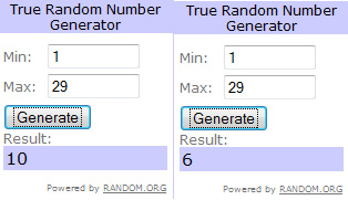 Dragii mei. Evident că aseară am ajuns, din nou, prea târziu ca să prind kinderul treaz. Mă mir că știe că mai are un tată. Așa că am apelat, din nou, la cel de-al doilea copil pentru extrageri, domnul random.org. Care, din jobenul său de 29 de comentarii le-a scos pe cele două câștigătoare. Numărul 10, Monica, și numărul 6, Radu. Verificați mailul și vă rog să răspundeți cât de repede se poate. Felicitări chiștigătorilor, baftă pe viitor celor mai puțin norocoși pentru că ocazii v-or mai fi, v-o promite Crocodilu.